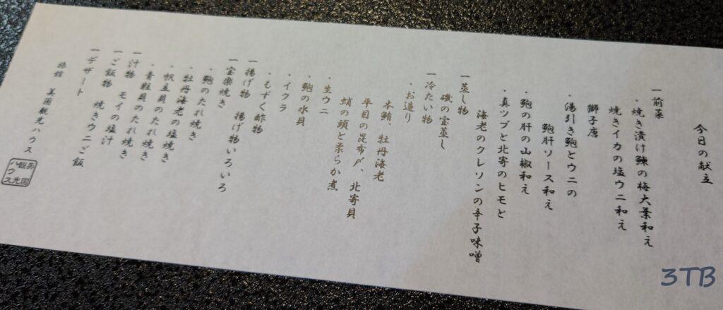 こんなのもう見ただけでニヤニヤしてしまいました。『磯の宝蒸し』、宝とはよく言ったものですね。本当にその通り。アワビ、エビ、ウニ、ホタテのサンドウィッチの繰り返し。何回繰り返されても食べれるやん、これ。